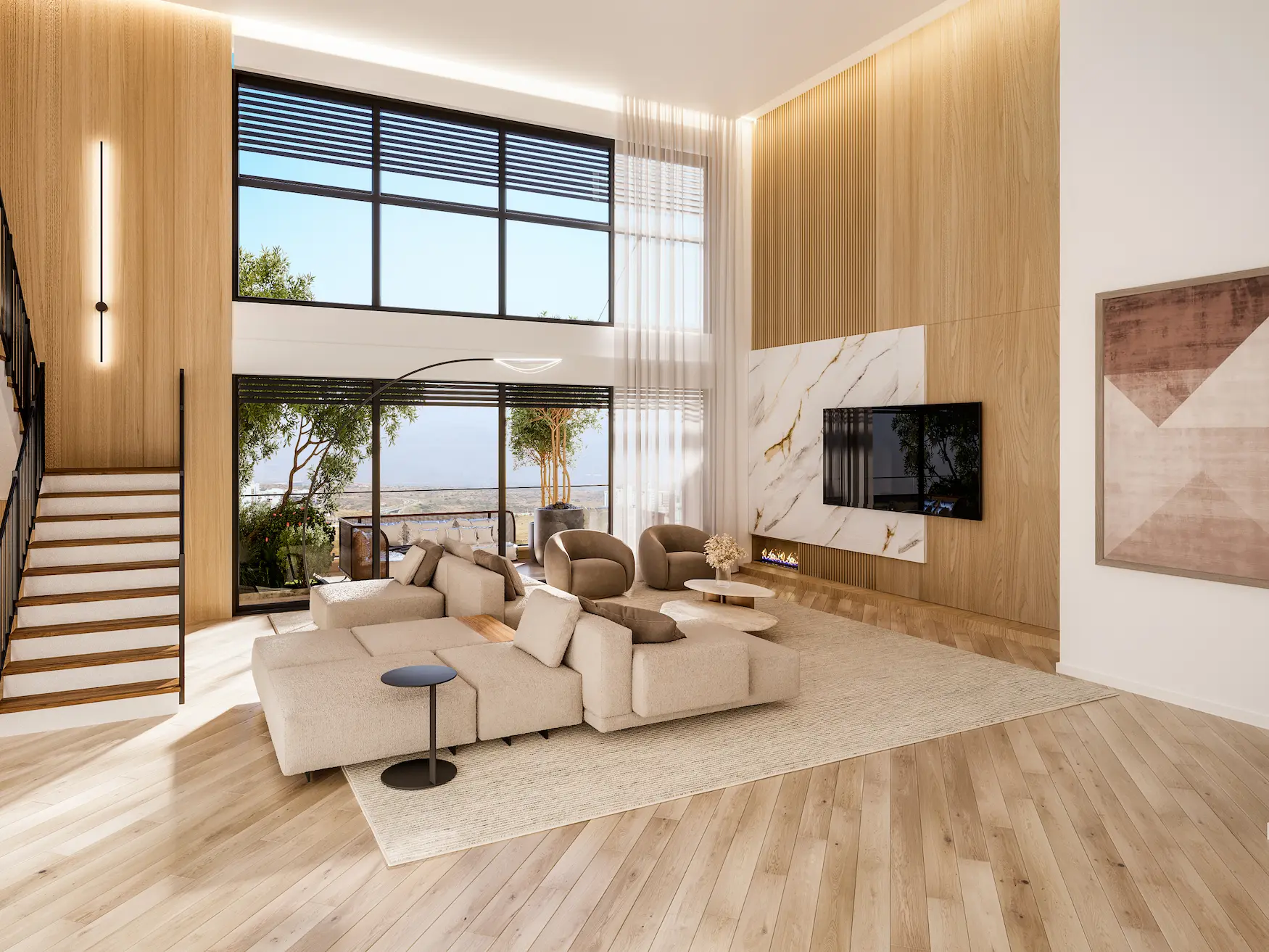 בקומות ב'-ג': שני דופלקס-פנטהאוז עם חלל כפול בין הקומות ומרפסות גדולות במיוחד.